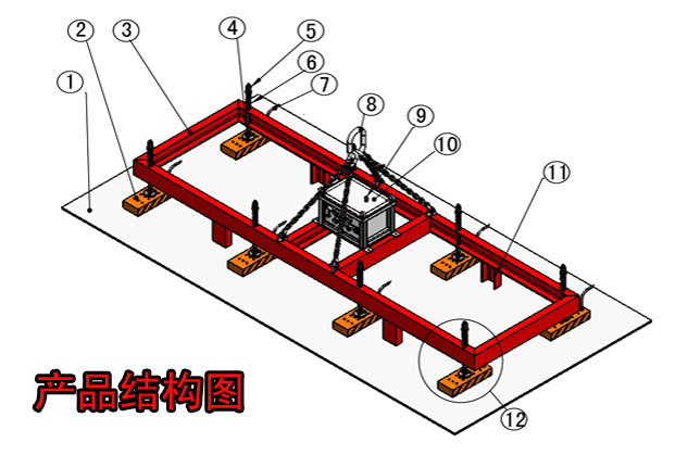 7.引出電纜 8.鏈條吊具 9.遙控器 10.電控箱 11.吊架支腳 12··